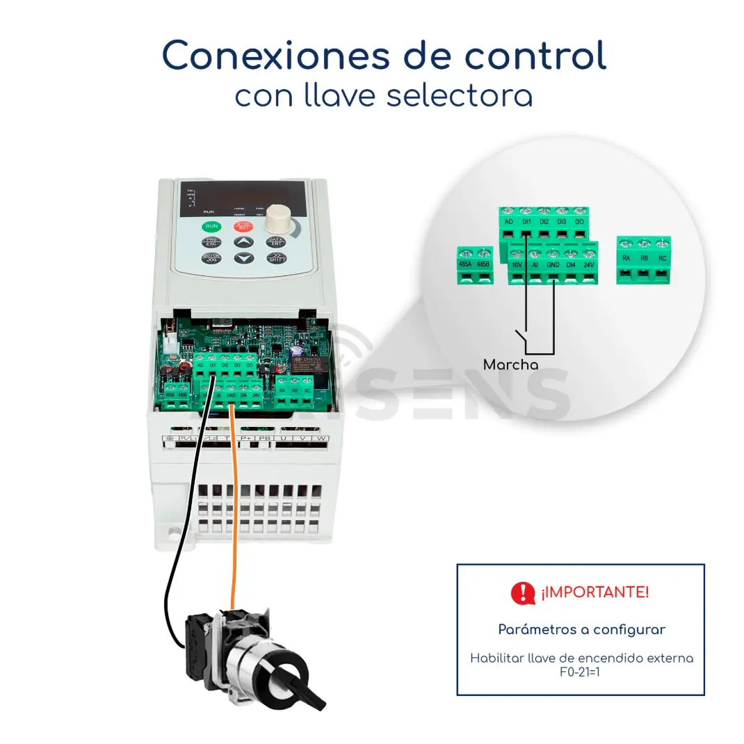 Te facilitamos todo el material necesario para que puedas configurar la Marcha y Contramarcha desde comandos externos como llaves selectoras, finales de carreras, sensores, pulsadores, contactores o cualquier contacto seco.