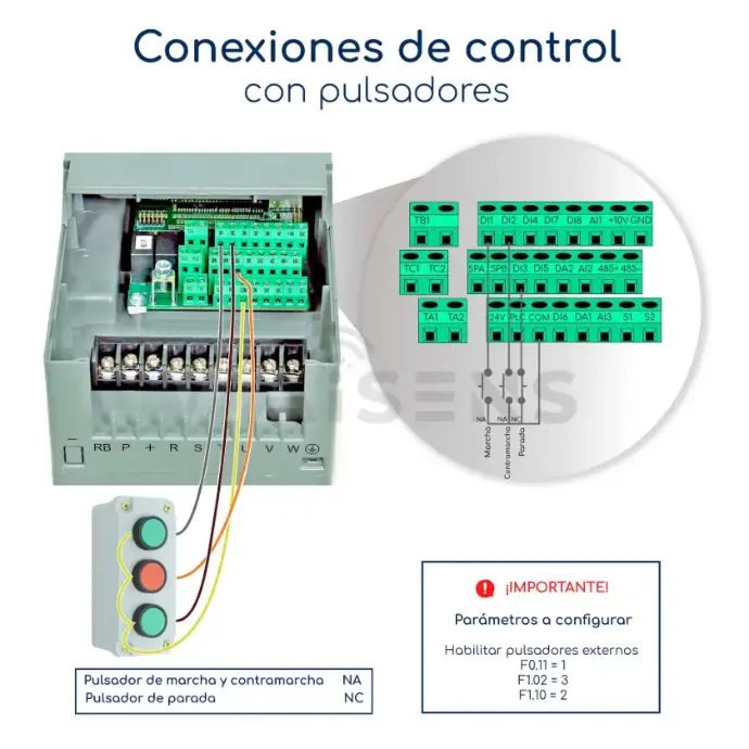 - Conecte el cable cable verde del pulsador de contra marcha en el borne DI2 del variador.