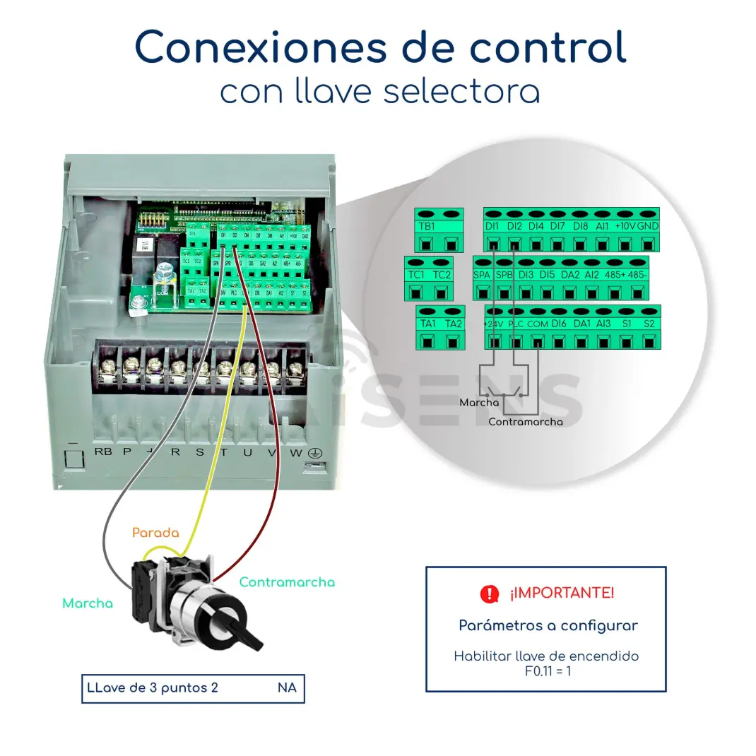 Te facilitamos todo el material necesario para que puedas configurar la Marcha y Contramarcha desde comandos externos como llaves selectoras, finales de carreras, sensores, pulsadores, contactores o cualquier contacto seco.