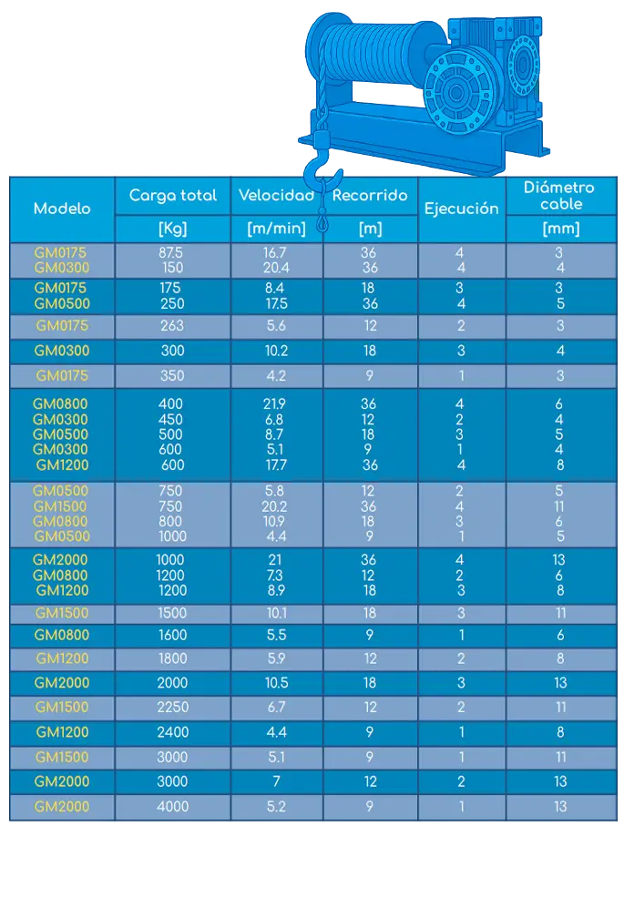 - Función principal: Sistema de tracción y elevación que combina motor eléctrico, reductor y tambor para mover cargas mediante cable de acero.